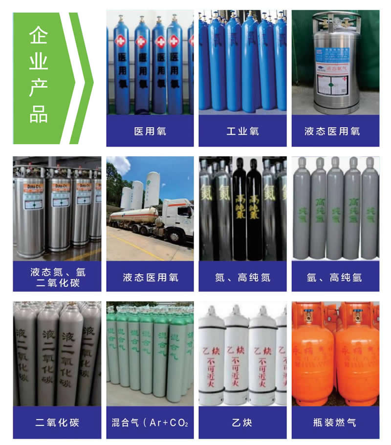 公司主要从事医用氧、工业氧、氮气、氩气、二氧化碳、混合气(Ar+CO2)、高纯气体(氩、氮)液化石油气充装销售;溶解乙炔生产充装销售;钢质无缝气瓶、铝合金无缝气瓶、溶解乙炔气瓶、焊接气瓶(液化石油气钢瓶、二甲醚钢瓶、丙烷气瓶)、低温绝热气瓶定期检验与评定。